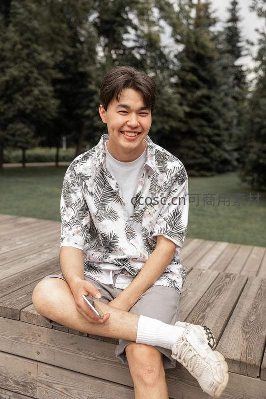 一位青年坐在户外木质平台上,穿着热带风衬衫和短裤,手握手机面带微笑,背景是郁郁葱葱的树林,尽显夏日悠闲。