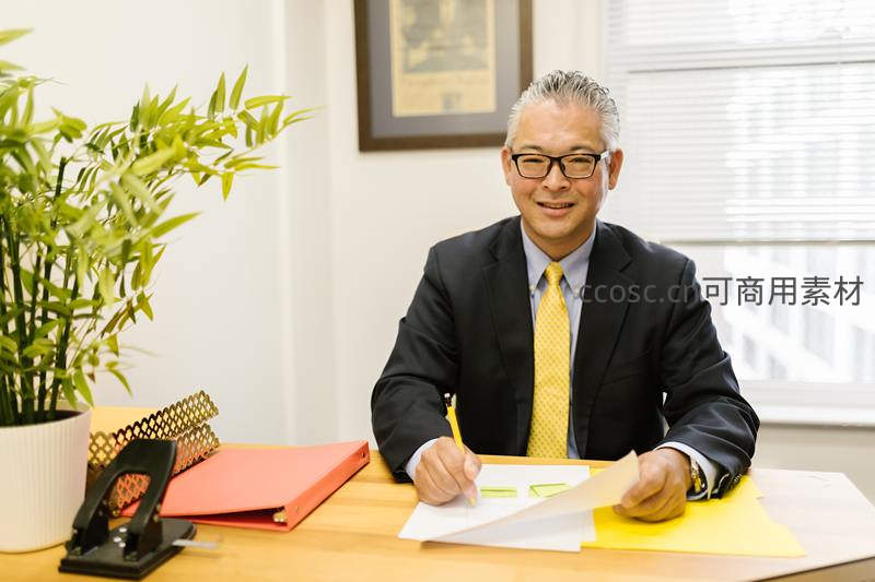 一位穿着深色西装、系着黄色领带的成熟男士坐在整洁的办公桌前,面带微笑审阅文件,背景窗明几净,桌上绿植增添生机与专业感。