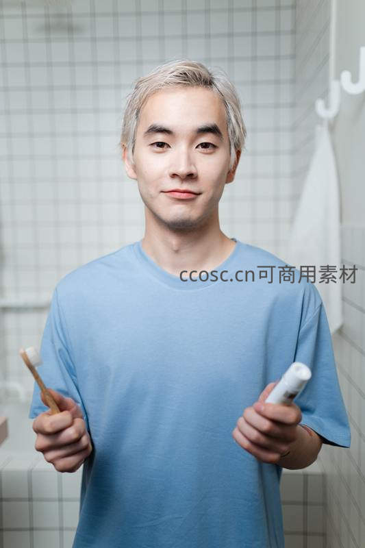 一位穿着蓝色T恤的年轻男子在铺有白色方格瓷砖的浴室中,手持牙刷和牙膏,面带温和微笑直视镜头,展现日常口腔护理场景。