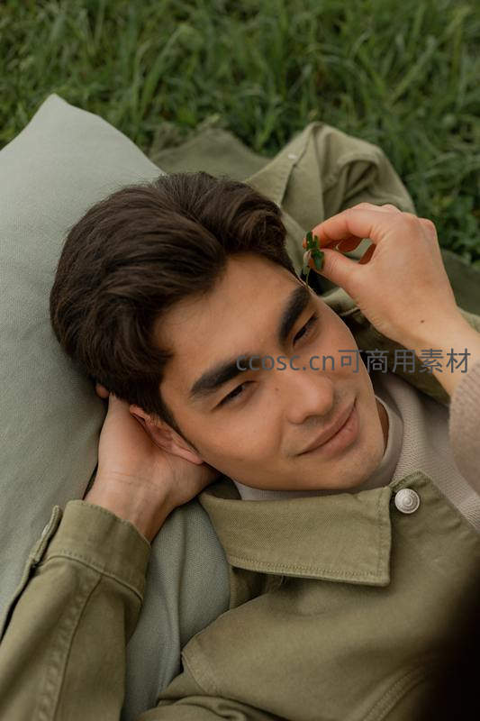 青年男子躺在绿草地上,手托头微笑,另一人轻触其发梢,画面温馨宁静,充满悠闲自在的生活气息。