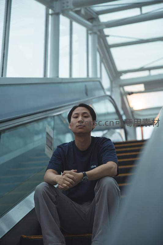 一名青年坐在地铁站扶梯台阶上,双臂交叠,神情平静,背景是玻璃顶棚与金属结构,体现都市生活的片刻宁静。