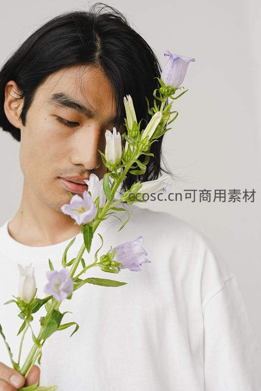 一位黑发青年身穿白色上衣,轻闭双眼,将一束淡紫色风铃草贴近面颊,神情宁静温柔,背景纯净简约,充满诗意与自然气息。