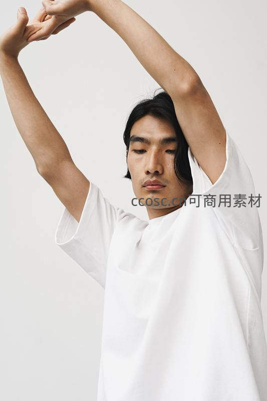 青年男子身着宽松白色T恤,在纯白背景下优雅地抬手伸展身体,展现放松与活力,传递出健康生活方式与极简美学的融合。