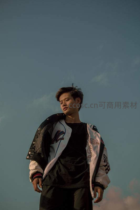 一位年轻男子身着黑白拼接夹克,在暮色天空下静静伫立,微风拂动衣角,神情专注而沉静,展现出都市青年的自由与洒脱。