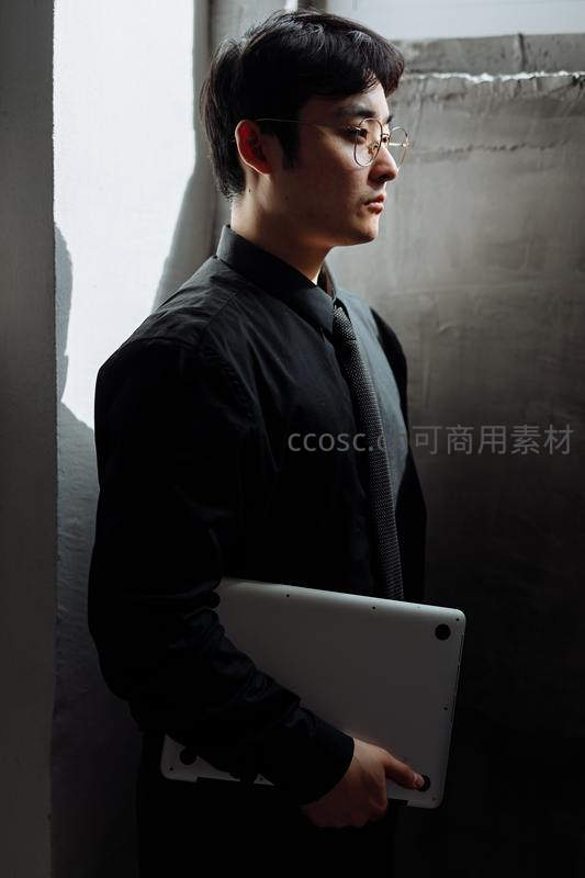 身穿黑色衬衫系领带的青年侧身站立,怀抱笔记本电脑,阳光从窗户斜射入室,照亮其侧脸与衣领,营造出理性、干练的现代职场氛围。