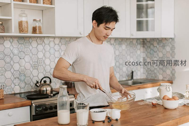 一位年轻男子在现代风格的厨房里认真搅拌碗中的面糊,周围摆放着新鲜鸡蛋、蓝莓和牛奶,氛围温馨而充满生活气息。