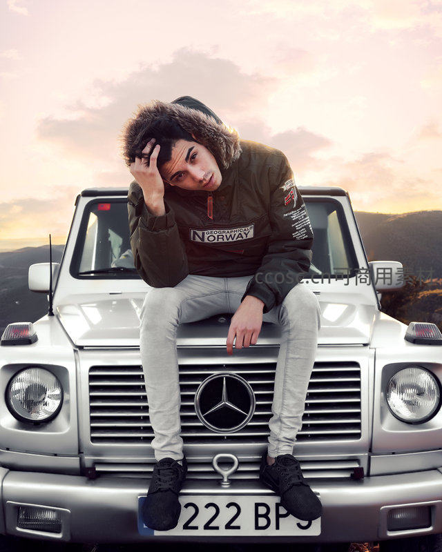 一位穿着带毛领夹克的青年坐在银色奔驰G级车头,手扶额头若有所思,背景是温暖的日落山景,尽显酷炫与宁静交织。