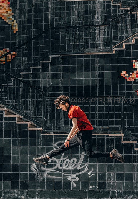 红衣青年在涂鸦楼梯间腾空跃起