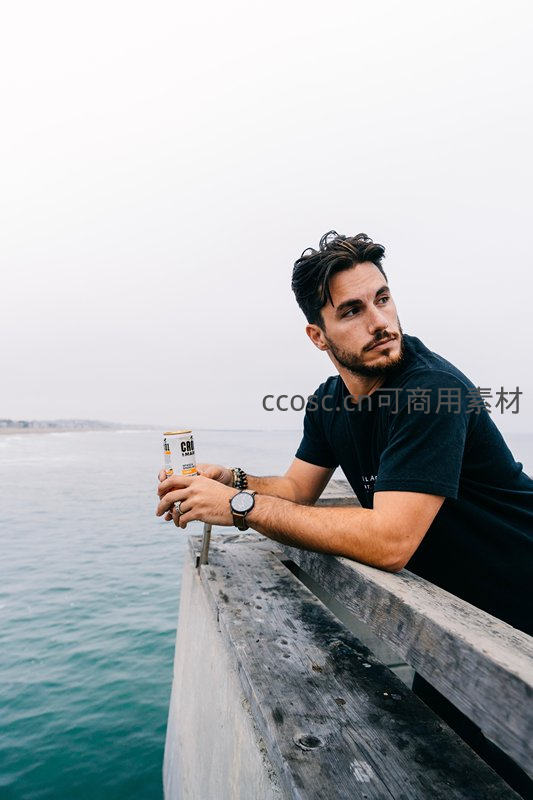 一位年轻男子倚靠在海边的木质栈道栏杆上,手握一罐饮料,凝视远方。背景是平静的海面与朦胧的天空,氛围宁静而放松。
