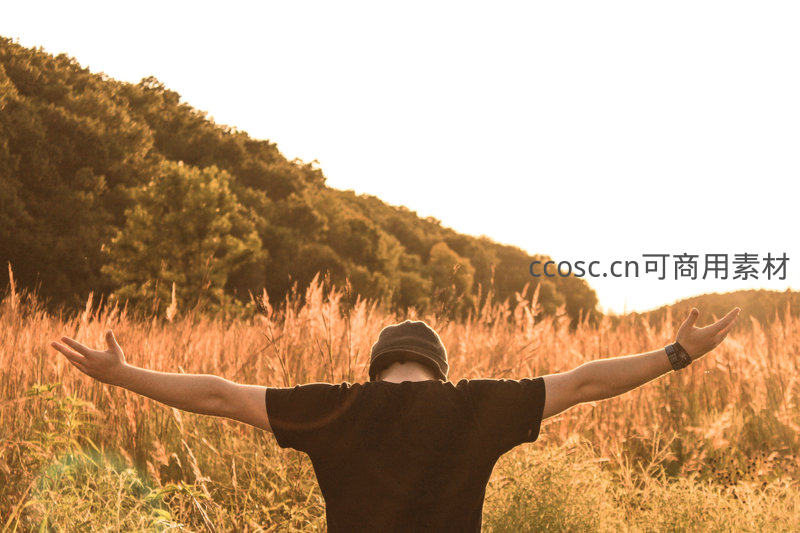 一人背对镜头,站在金黄色的草地上,双臂向两侧展开,迎接落日余晖。远处山林轮廓清晰,营造出一种释放自我、亲近自然的意境。