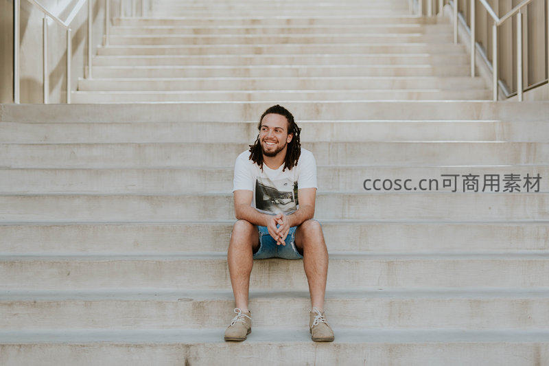 一位留着脏辫的年轻男子坐在宽阔的混凝土台阶上,面带灿烂笑容,享受着惬意的户外时光,展现出轻松自在的生活态度。