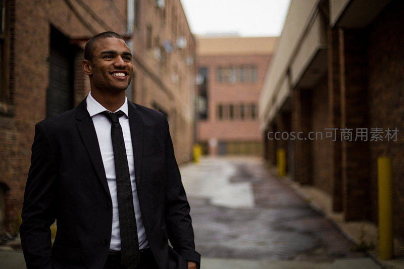 一位身着黑色西装的男士走在城市砖墙小巷中,脸上洋溢自信微笑,背景虚化突出主体优雅气质。