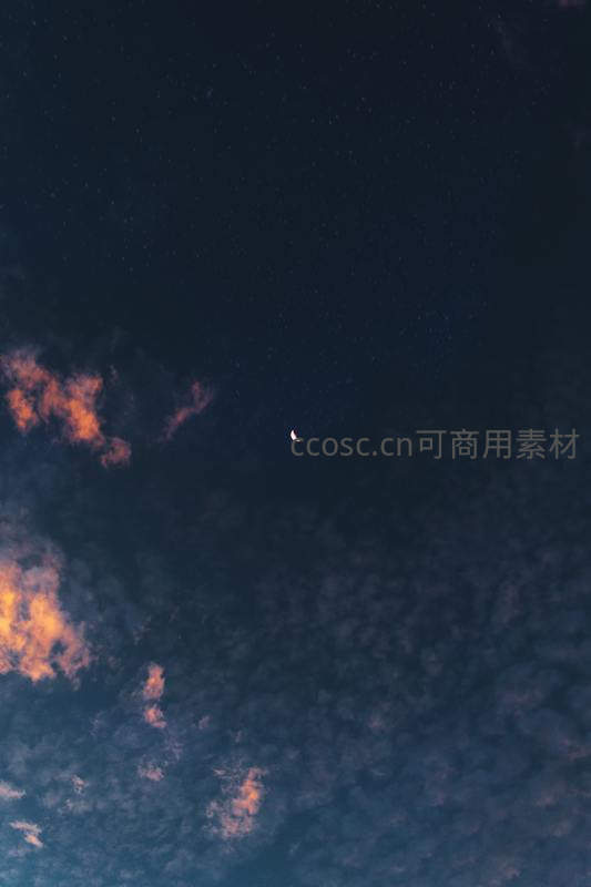 繁星点缀的夜幕下,云层如海浪翻涌,一弯新月静静浮于其间,营造出如梦似幻的诗意画面。