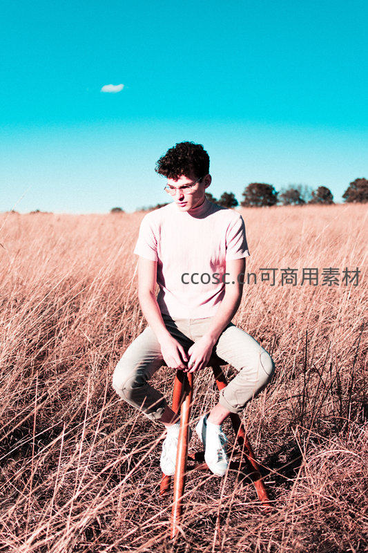 一位戴眼镜的青年坐在干草丛中,低头沉思,背景是湛蓝天空与远处树林,营造出宁静而略带忧郁的氛围。