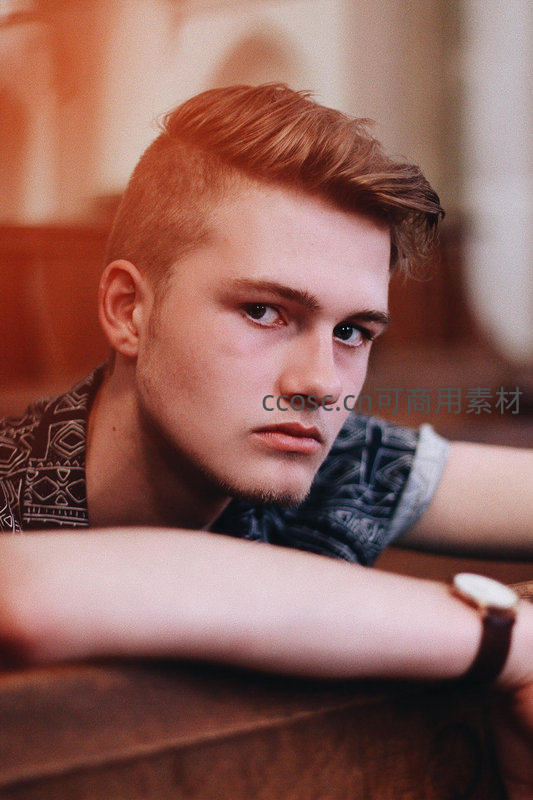 一位染着红色头发的年轻男子,眼神专注地直视镜头,手肘撑在木质桌面上,暖色调灯光烘托出慵懒又沉静的室内氛围。