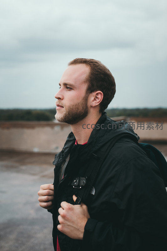 一位留着胡须的年轻男子站在城市屋顶,身穿黑色防风外套,手握衣襟,目光投向远方阴云密布的天际,神情宁静而深邃。