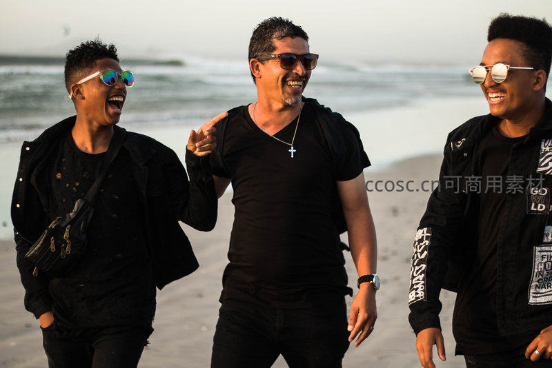 三位年轻男性在沙滩上并肩行走,笑容灿烂,享受着海边的轻松时光,背景是波光粼粼的海面与柔和日光。