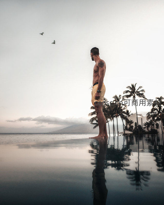 赤裸上身的男子站在无边泳池边缘,背对镜头遥望远方海天一线,水面上清晰倒映椰林与飞鸟,尽显奢华度假氛围。