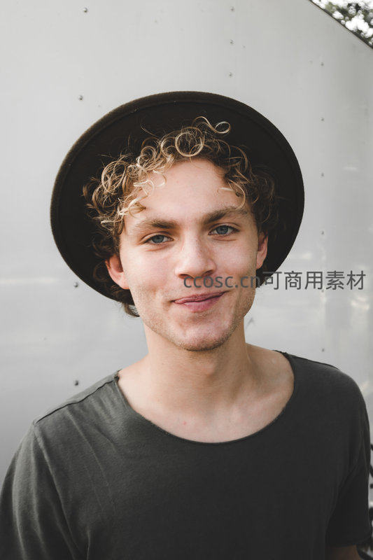 一位金发卷曲的年轻男子戴着黑色宽檐帽,面带温和微笑,背景为简约的浅色墙面,整体氛围轻松自然。