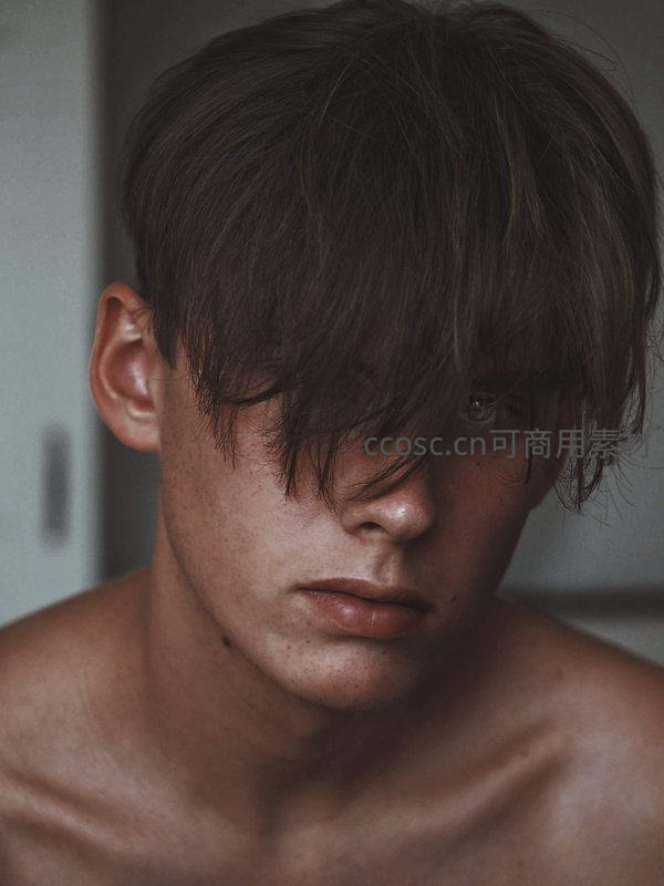 一位年轻男性以深色凌乱刘海半遮双眼,表情略显沉思,柔和光线勾勒出肌肤纹理,营造静谧而内省的氛围。