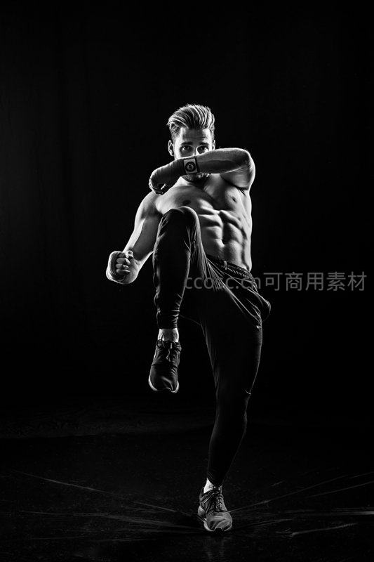 一名健硕男子在纯黑背景下展示高难度踢腿动作,凸显其发达的腹肌与爆发力,充满动感与力量美学。
