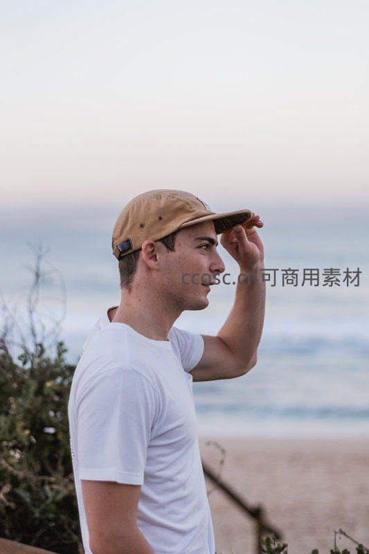 男子立于海岸边,手扶帽檐凝望海平线,柔和暮光洒落,营造出静谧、沉思与自由的海滨度假氛围。