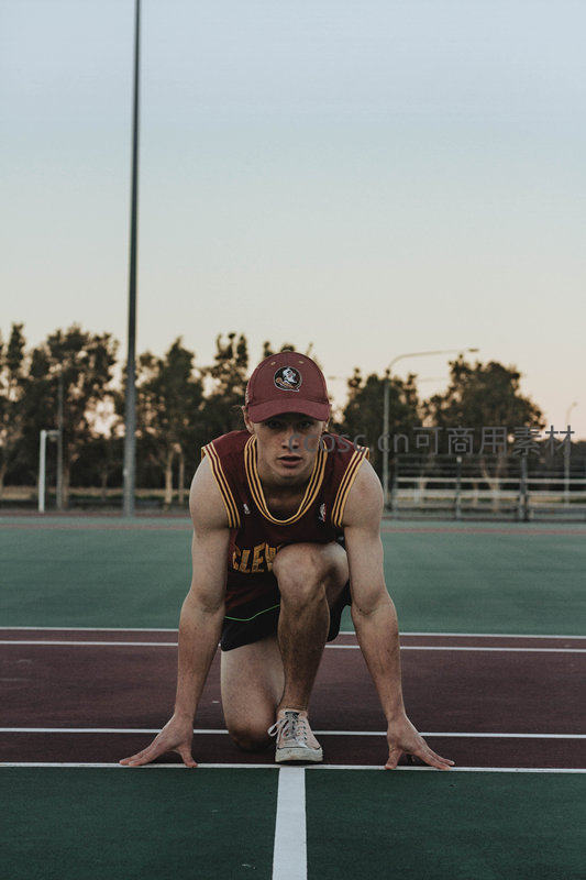 一名年轻运动员在红色塑胶跑道上摆出起跑姿势,身穿运动背心和棒球帽,眼神专注,背景是黄昏时分的球场与树木,充满竞技张力。