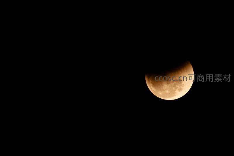 在漆黑的夜幕下,月亮正经历偏食过程,一半被地球阴影遮蔽,另一半则呈现出迷人的血红色调。