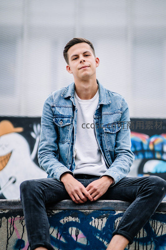 一位年轻男子身穿蓝色牛仔夹克,坐在充满艺术气息的涂鸦墙前,神情放松自然,展现都市街头的青春活力与个性风采。