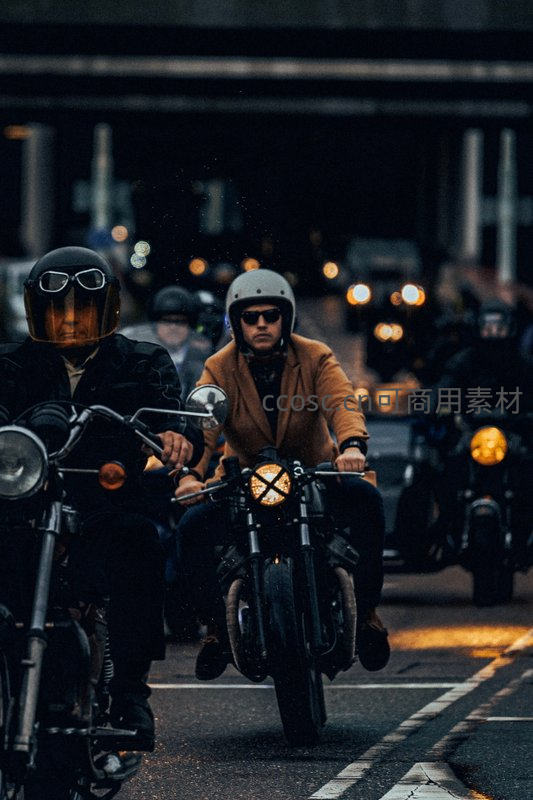 一群戴着头盔的机车骑士在夜晚的城市街道上并肩骑行,车灯闪烁,背景虚化,营造出酷炫、自由且充满速度感的街头氛围。