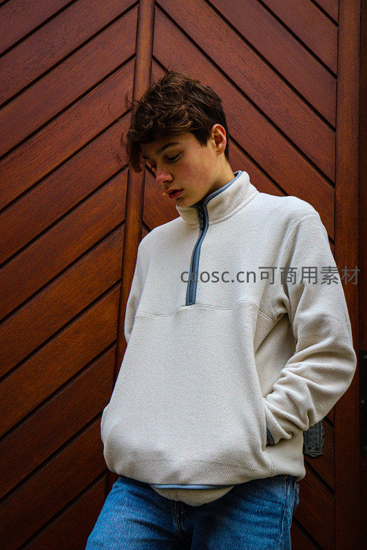 一位少年身穿米色卫衣,靠在有几何纹理的木质墙边,低头若有所思,展现出青春的内敛与时尚感。