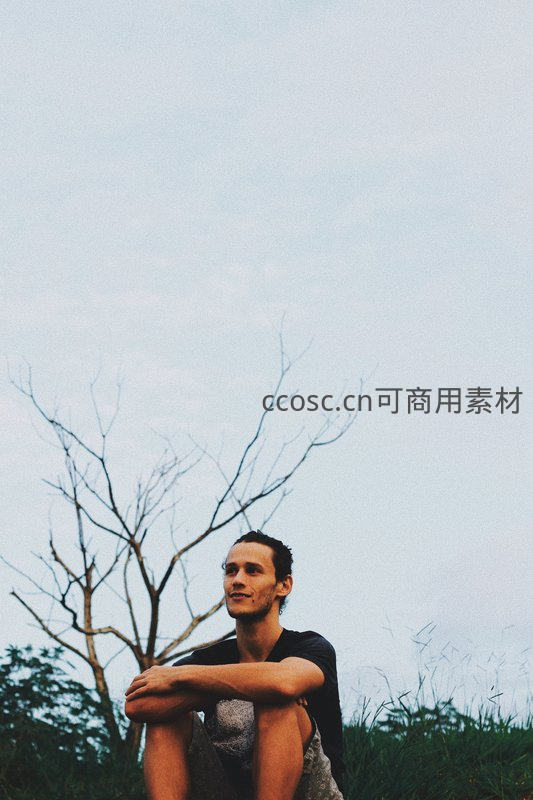 一位年轻男子坐在草地上,背景是枯树与天空,他面带微笑,眼神望向远方,展现出宁静与沉思的氛围。