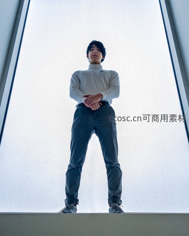 从低角度仰拍一位青年站在明亮窗户前,光线柔和洒落,营造出干净、现代且富有艺术感的视觉效果。