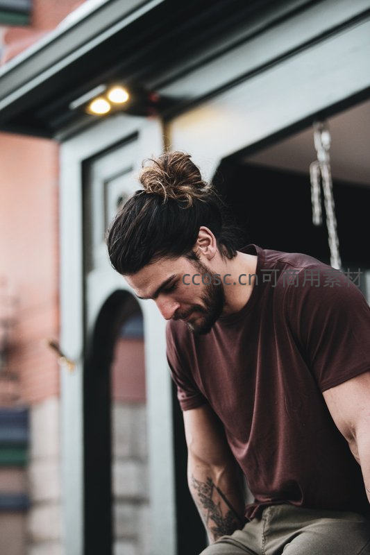 一位扎着丸子头、手臂有纹身的男子低头凝思,身穿深红色T恤,坐在店铺门廊下,柔和光线勾勒其轮廓,充满故事感与情绪张力。