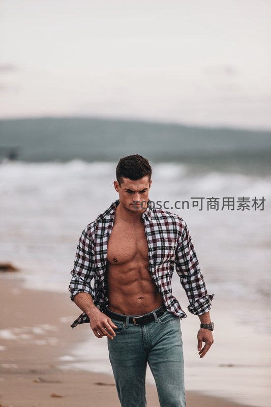 一名肌肉线条分明的男子解开格子衬衫,在海浪拍打的沙滩上行走,展现出力量与自然美景的和谐交融。