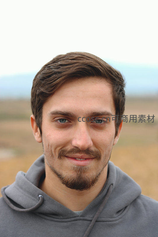 一位留着胡须、身穿灰色连帽衫的青年在开阔的田野前微笑,背景是朦胧的远山,传递出轻松愉悦的田园气息。