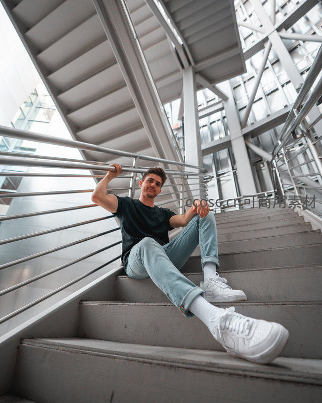 一位穿着简约T恤和浅色牛仔裤的青年坐在现代风格的金属楼梯上,姿态放松,展现都市年轻人的随性与活力。