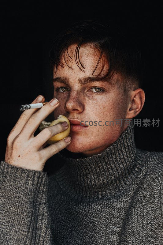 少年脸上布满雀斑,一手持烟一手握苹果,眼神深邃直视镜头,在纯黑背景下营造出忧郁、叛逆又略带诗意的视觉冲击。