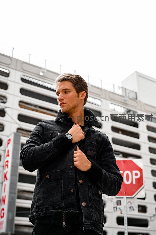 一位帅气的青年站在多层停车场前,正整理黑色牛仔夹克,目光投向远方,展现出都市潮流与沉思的氛围。
