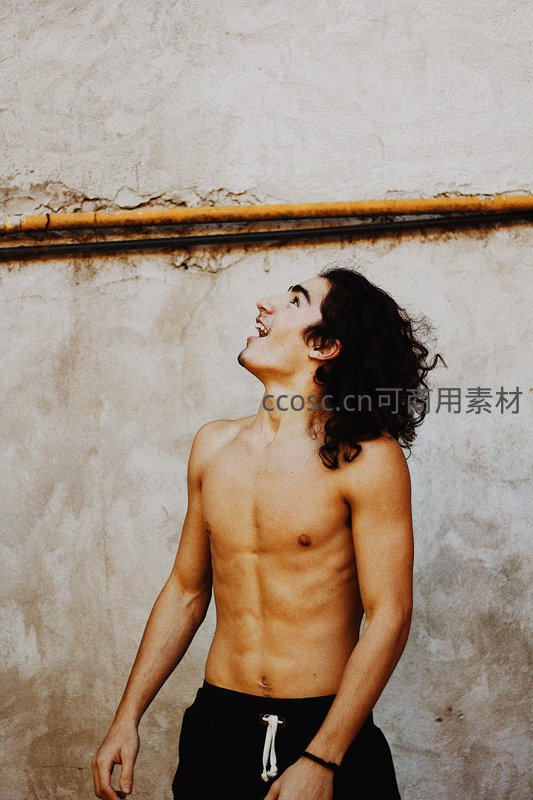一位赤裸上身的年轻男子靠在斑驳的墙边,仰头开怀大笑,阳光勾勒出他健美的线条,传递出无拘无束的青春活力。
