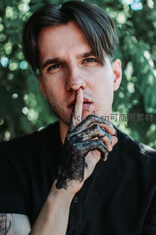 一位年轻男子在绿意盎然的背景下,手指沾满泥土轻触嘴唇,神情专注而神秘,展现出一种与自然交融的静谧美感。
