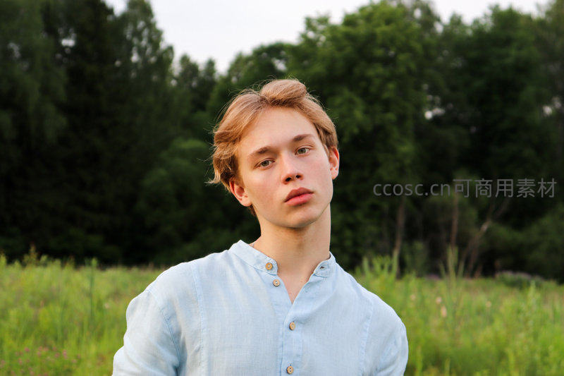 一位金发少年站在郁郁葱葱的草地上,身穿浅蓝色衬衫,眼神清澈而略带忧郁,背景是茂密树林,整体氛围宁静自然又充满青春气息。