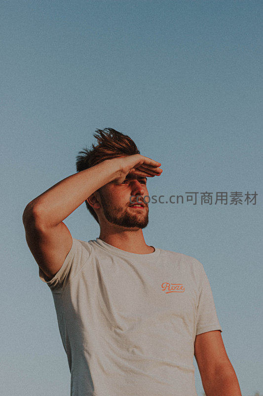 一位留着胡须的男子站在晴朗蓝天下,用手遮挡阳光眺望远方,神情专注而自由,传递出探索未知、享受户外生活的积极态度。