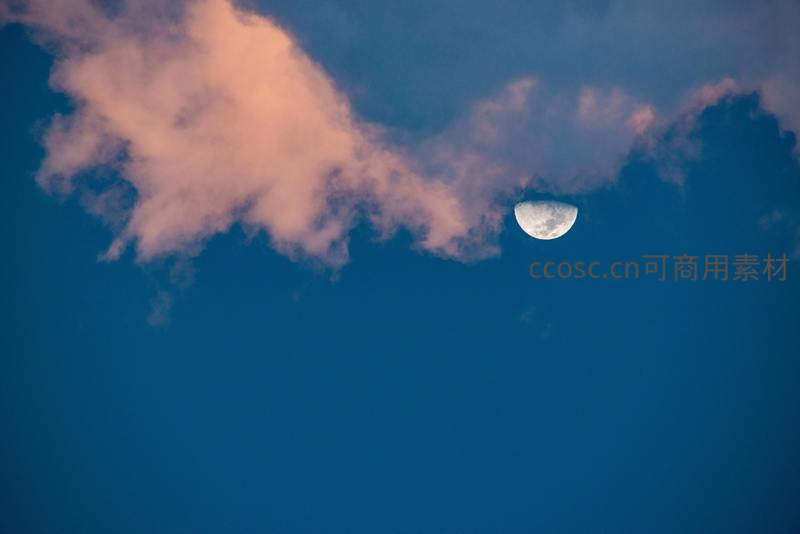 深蓝色的天空中,一朵被夕阳染成粉橙色的云彩轻柔飘过,半轮明月从云隙中探出,营造出梦幻唯美的黄昏景象。