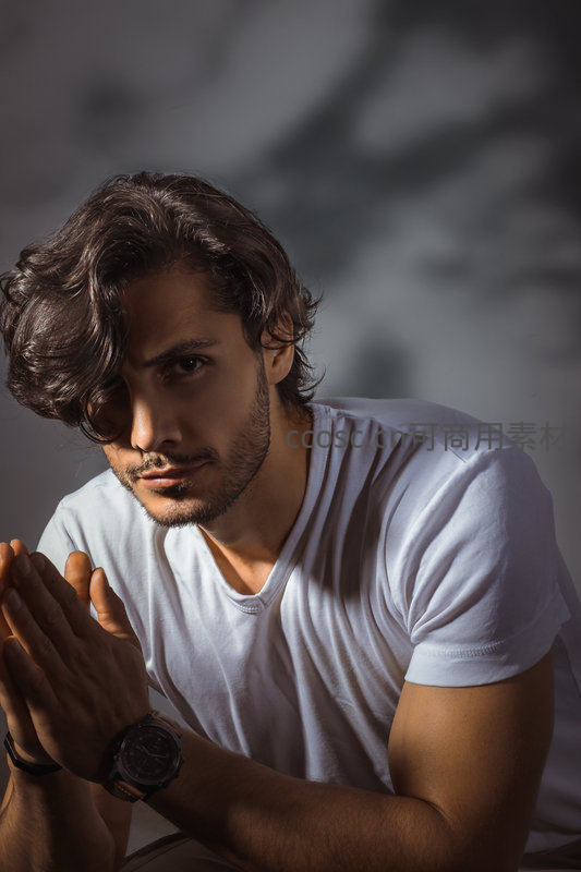 一位留着卷发和胡须的年轻男子身穿白色T恤,在柔和的侧光下凝视镜头,表情深邃,展现出一种沉静而有力量的气质。