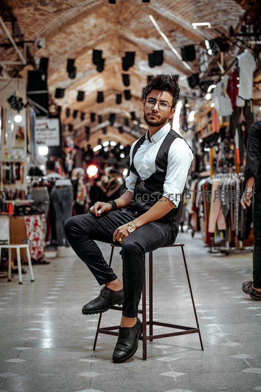 时尚男士坐于市场高凳,复古拱顶下尽显都市格调