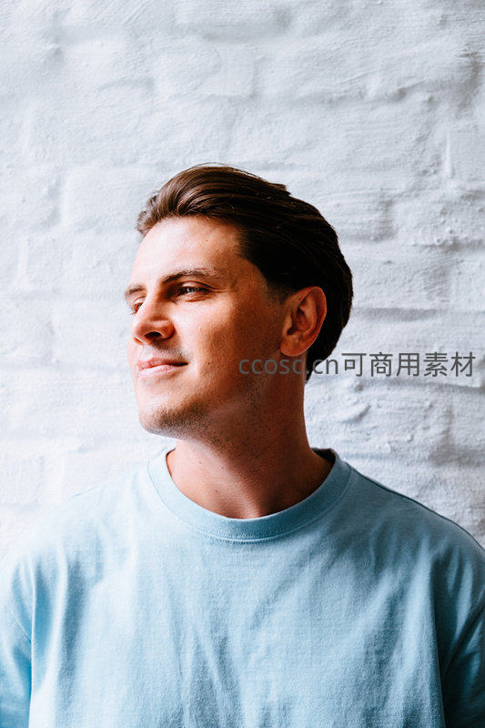 一位青年倚靠在白色砖墙旁,侧脸带着淡淡微笑,阳光洒在脸上,营造出温暖、宁静又略带文艺气息的氛围。