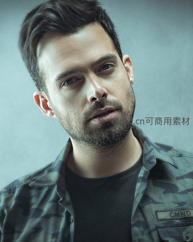 一位留着胡须的男子身穿迷彩衬衫,神情专注而沉静,背景简约,凸显其硬朗气质与个性魅力。