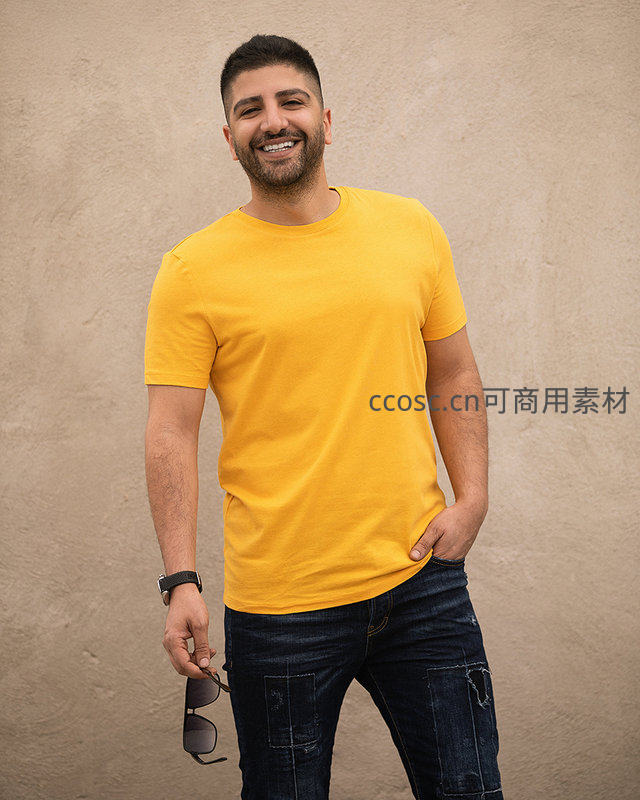 男子身穿明亮黄色T恤,面带灿烂笑容,手握墨镜,背景为质朴墙面,传递轻松愉悦的日常休闲风格。