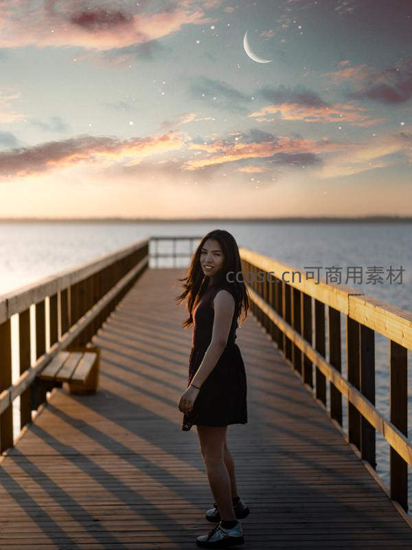 一位少女站在延伸至水中的木质栈桥上,背景是梦幻的晚霞与弯月,营造出宁静而唯美的氛围。